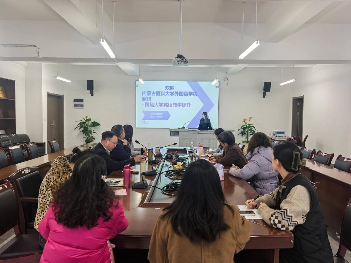 内蒙古医科大学i88娱乐城 院长陈佳欣一行于20251114日来i88娱乐城(简体中文)官方网站 开展调研交流活动。i88娱乐城(简体中文)官方网站 书记、院长付启宏,副院长冉海勇,教学科研管理科,英语教研室,大英教研室等各科室教师出席座谈会。此次调研聚焦医学英语课程改革、大学英语课程设置、分层教学实践等核心议题,旨在借鉴先进经验,推动双方外语教学高质量发展。